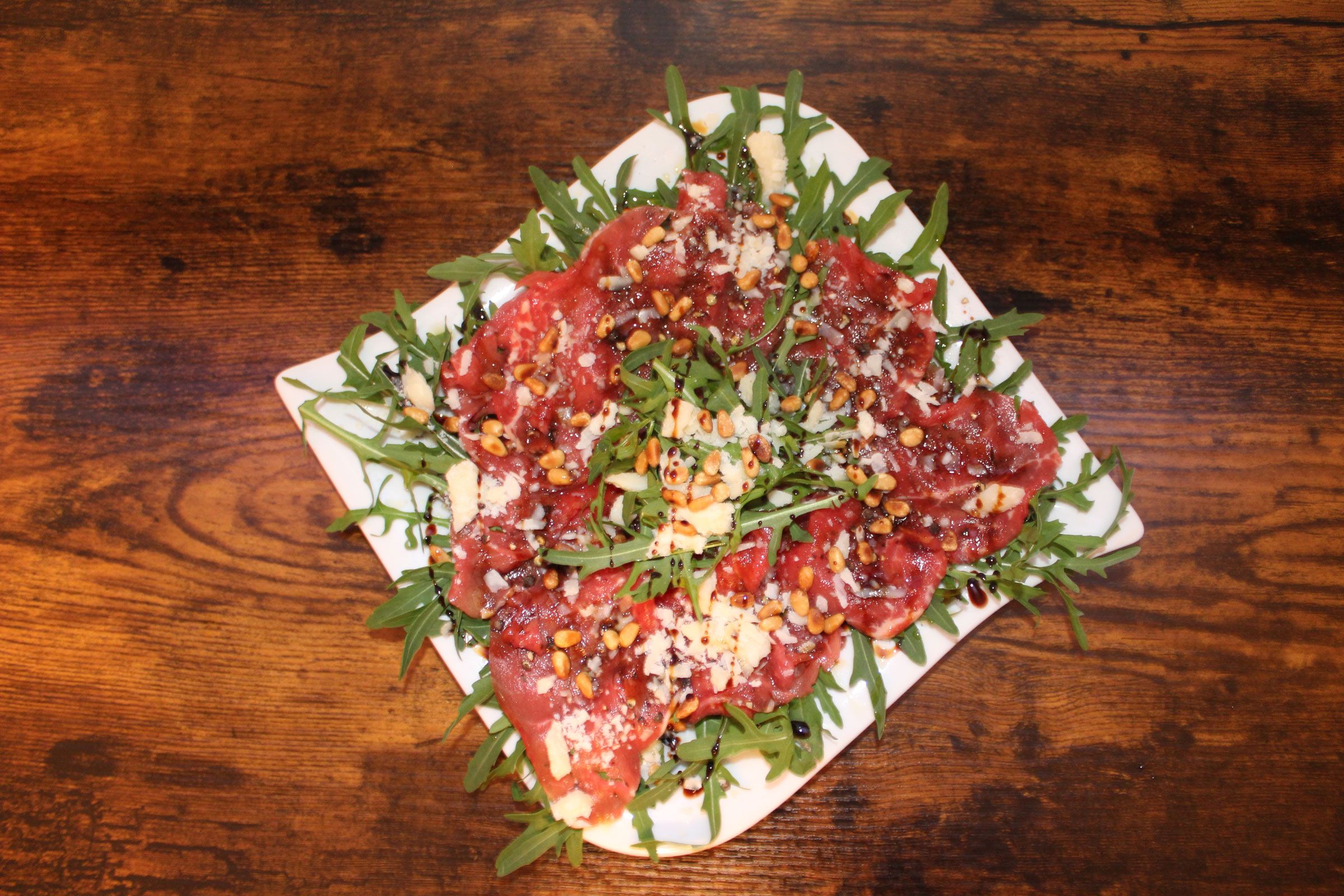 10 Min. 4 Personen Zuaten: 400g Rinderfilet hauchdünn geschnitten, 300 Rucola, 200g Stk. Parmiggiano Reggiano DOP, 2 Zitronen, 100 g Pinienkerne, Aceto Balsamico di Modena IGP, Olivenöl, Pfeffer, Meersalz, Baguette. 4 Teller mit Balsamico beträufeln und mit einem Pinsel verteilen.